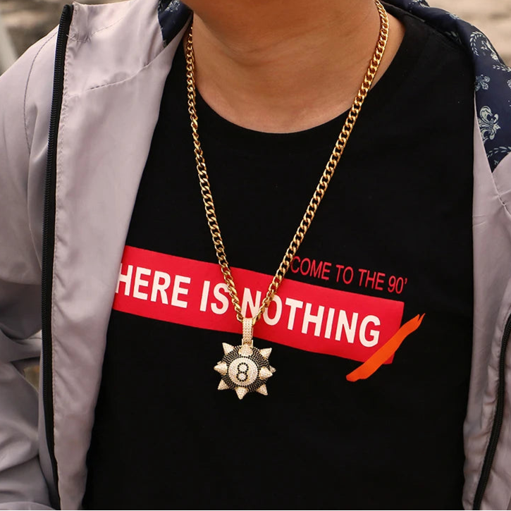 Break the mold with the Iced Out Spiked 8 Ball Pendant with Cuban Chain, a bold twist on a streetwear classic. Featuring a detailed 8 ball design surrounded by edgy spikes and fully encrusted with shimmering cubic zirconia stones, this piece brings serious attitude and shine. Paired with a heavy-duty Cuban link chain, it’s perfect for turning heads and leveling up your hip hop jewelry game—all at a price that keeps your wallet cool.